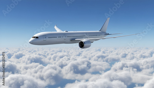 White Airplane Boeing 787 Modern Passenger Jet Plane Flying Above White Clouds and Blue Sky Corner Front View Angle