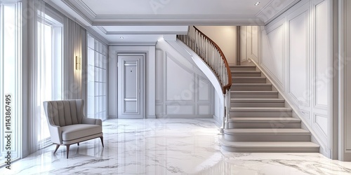 white and grey luxury apartment corridor with armchair, elegant wooden staircase and marble floor