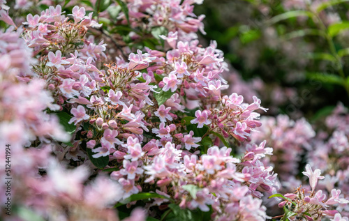 white and pink flowers of Abelia x grandiflora shrub