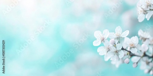White and turquoise spring banner with copy space, cherry blossoms, blurred background, soft lighting.