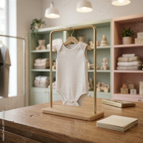 White baby bodysuit mockup on wooden hanger. Minimalist gold display stand in children's boutique