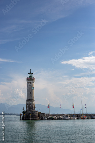 White big lighthouse on the Bodensee Lindau Germany with pier and flags reflecting in the water