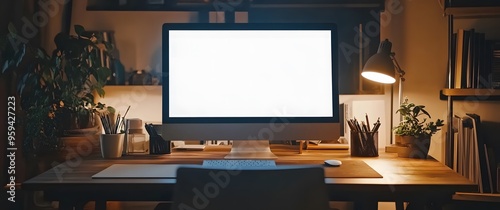 white blank computer screen on the desk of an aesthetic home office,workspace