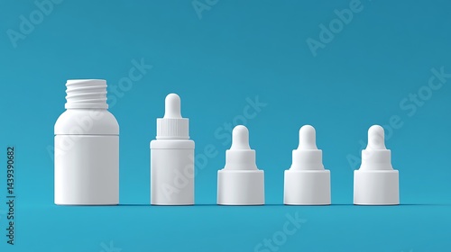 bottle, container, white, liquid, dropper, medicine, pharmaceutical, cardboard box, design, product, display, studio, simple, clean, graphic, modern, blank, empty, row, set, variety, size, different, shape, medicals, health, care, serum, cosmetic, beauty, illustration, three-dimensional, rendering, presentation, isolated, light, background, colours, blue, minimalism, geometric