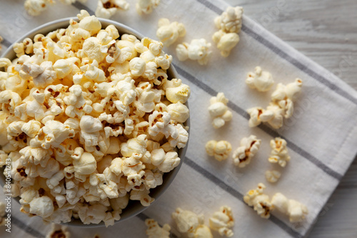White Buttered Popcorn with Salt in a Bowl, top view.