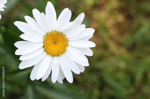 White camomile on a green lawn background