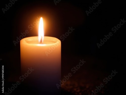 White candle burning in the dark for funeral and memorial services, glowing flame against black studio background with copy space for religious or sympathy branding
