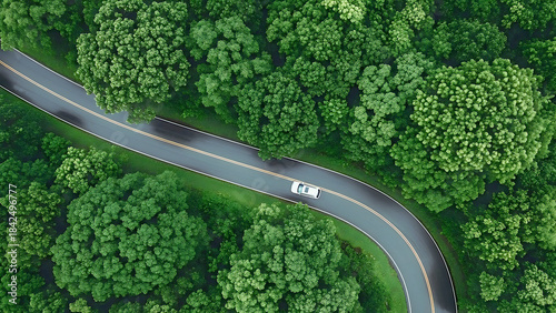 aerial, view, overhead, car, road, winding, curve, forest, tree, green, nature, travel, journey, drive, path, transportation, vehicle, landscape, scenery, wood, natural, environment, summer, lush, leaf, asphalt, bend