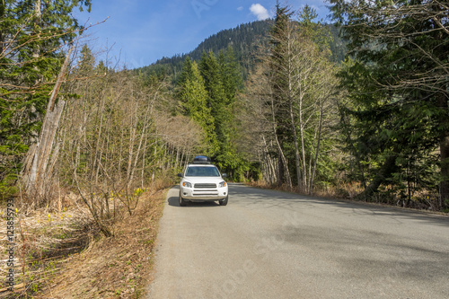 White car on the highway in the mountains in the forest