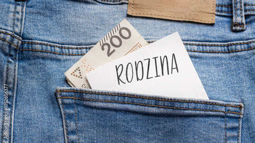 White card with a handwritten inscription "Rodzina", put into the pocket of blue pants jeasnow, next to Polish banknotes PLN (selective focus), translation: Family