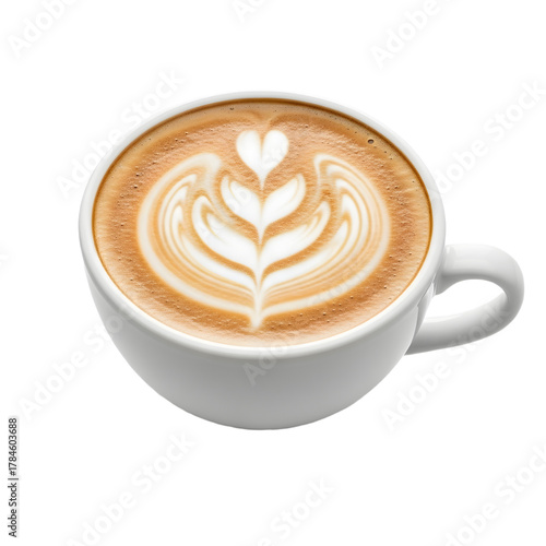 White ceramic cup of hot cappuccino with beautiful rosetta and heart latte art design.