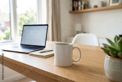 White ceramic mug on wooden desk with laptop in bright home office
