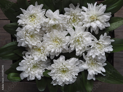 White Chrysanthemum in flower pot on grey wooden backround, horizontal.