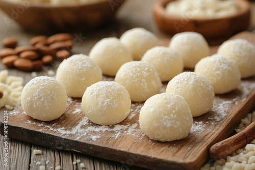 White coconut balls with powder on wood table, almond background. Ideal for sweets, desserts, or holiday recipe blogs and social media.