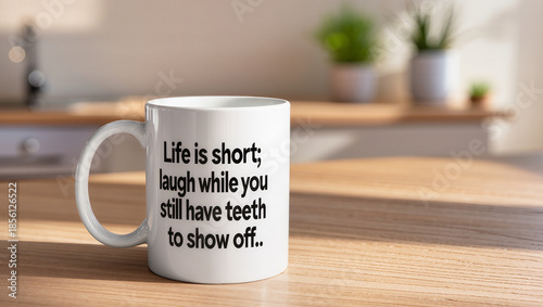 coffee mug, white cup, wooden table, morning, breakfast, caffeine, beverage, lifestyle, interior, joke, humor, teeth, laughing, gift idea, ceramic, sunlight, bright, airy, minimalist, tabletop, still life, houseware, home decor, blurred background, bokeh, workspace, porcelain, positivity, motivation, inspiration, relaxation, cosy, comfort, teacup, handle, blank space, copy space, artificial intelligence
