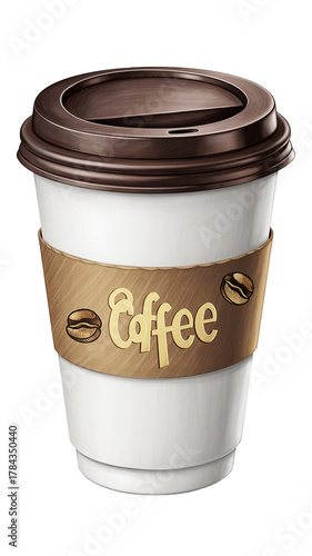 White disposable coffee cup with brown lid and sleeve isolated on transparent background
