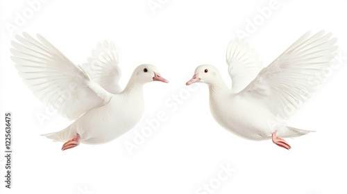 White Doves in Flight Against a Plain White Background