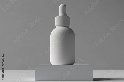 White dropper bottle on a white cube against a gray background.