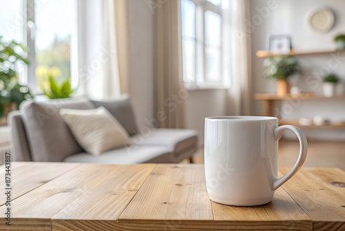White empty mug on wooden table in cozy home interior, white, cup, mug, empty, clean, simple, tabletop, minimalistic