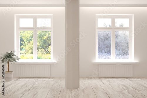 White empty room with summer and winter landscape in window. Scandinavian interior design. 3D illustration