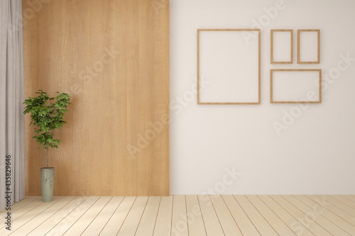 White empty room with wooden wall decor and frames on a wall. Scandinavian interior design. 3D illustration