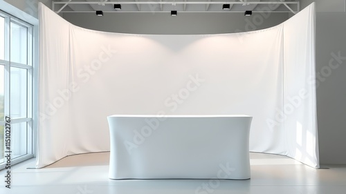 display stand, advertising, marketing, furniture, white, photorealistic, exhibition, counter, table, presentation, business, promotion, show, portable, graphic design