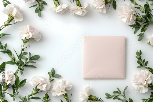White flowers and greenery frame blank square on white surface