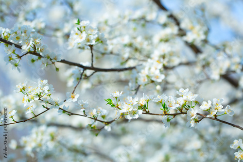 White flowers bloom in the trees. Spring landscape with blooming sakura tree. Beautiful blooming garden on a sunny day. Copy space for text.