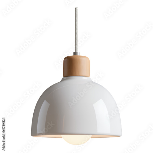 White Glossy Dome Pendant Light with Wooden Top, Modern Lighting Design Element on Transparent Background