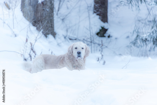 White Golden Retriever in Snow on a Winter Day