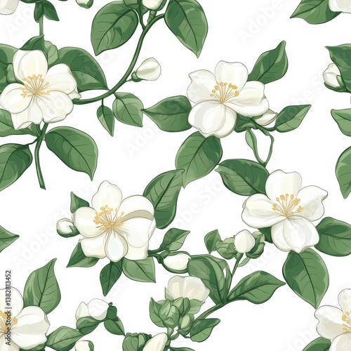 White Jasmine Flower Seamless Pattern Botanical Watercolor Illustration