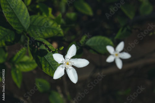 White Jasmine Flowers in Bloom, beautiful, Close up of white jasmine flower in dark background with light. blooming in the garden