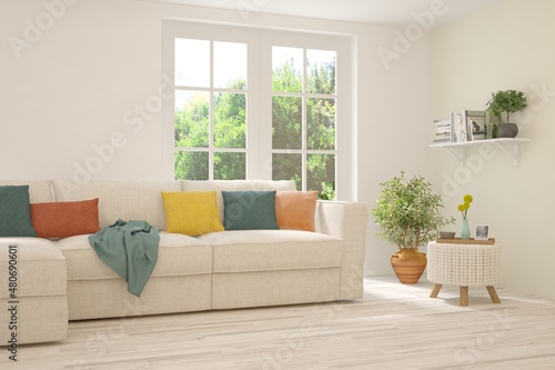 White living room with sofa and summer landscape in window. Scandinavian interior design. 3D illustration