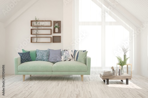 White living room with sofa. Scandinavian interior design. 3D illustration