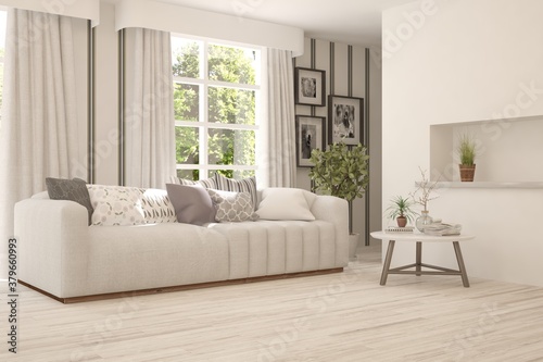 White living room with sofa. Scandinavian interior design. 3D illustration