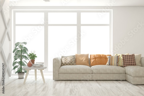 White living room with sofa. Scandinavian interior design. 3D illustration