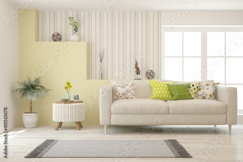 White living room with sofa. Scandinavian interior design. 3D illustration