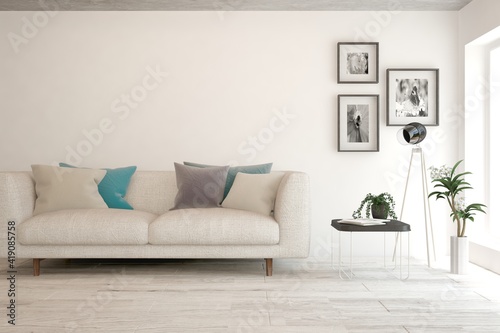 White living room with sofa. Scandinavian interior design. 3D illustration