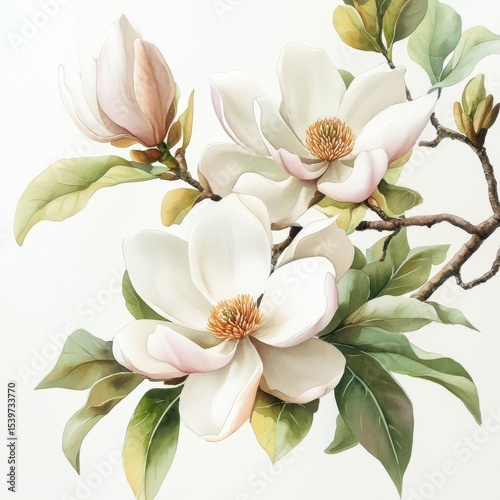 magnolia, flower, blossom, bloom, white flower, floral, botanical, plant, nature, spring, summer, garden, artwork, painting, illustration, watercolor, art, design, elegant, beautiful, delicate, soft, pastel, subtile, tree branch, leaf, green leaf, closeup, detailed, realistic, macro, photo, fine art, white background, cream, light, soft light, natural light, floral arrangement, floral pattern, spring flower