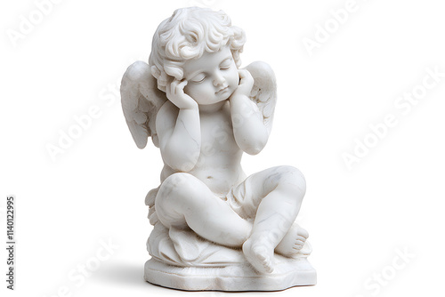 White marble statue of sitting cherub, isolated on white background