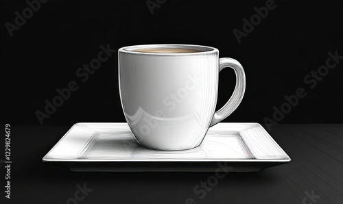 hot drink, mug, saucer, white, ceramic, drink, beverage, hot, dark, background, still life, simple, elegant, clean, minimalist, line, vignetting, illustration, drawing, art, graphic, design, morning, cafes, relaxation, warmth, comfort, quiet, peaceful, monochrome