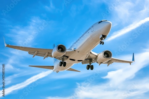 White Passenger Airplane Approaching Landing with Gear Down and Contrails in the Sky
