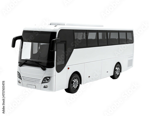 bus, white, passenger, vehicle, transportation, road, travel, journey, coach, exterior, modern, sleek, design, clean, line, window, dark, tinted, glasses, wheel, tire, round, black, background, isolated, studio, cut-out, perspective, angle, forward, light, headlamp, grille, windscreen, driver, seat, interior, empty, large, roomy, comfortable, commercial, holiday maker, public, transit, urban, suburban