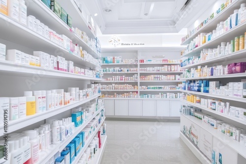 White pharmacy interior with shelves of medical products and colorful packaging, professional and inviting atmosphere.