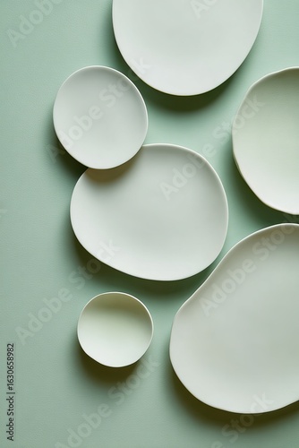 White plates of different sizes on a light green background, in a minimalist style, with circular shapes, soft edges, and blurred details, in the style of Japanese photography.