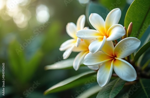 White plumeria blossoms with yellow centers and green leaves. Tropical flowers grow in garden. Frangipani bloom in sunlight. Peaceful natural scene.