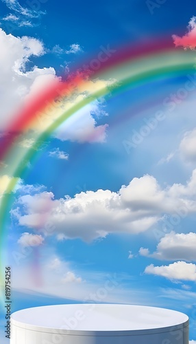 white podium with blue sky background and rainbow in the clouds