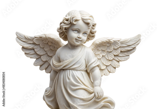 White porcelain cherub angel statue with outstretched wings and curly hair, isolated on a transparent background
