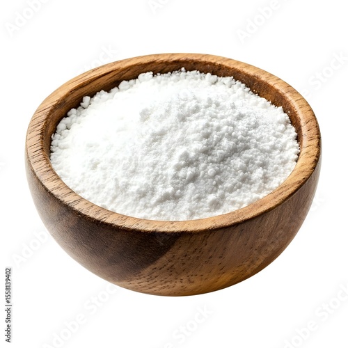 White powder in a wooden bowl, isolated on a white background.