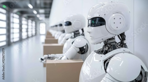 White Robots in Modern Warehouse, AI Automation